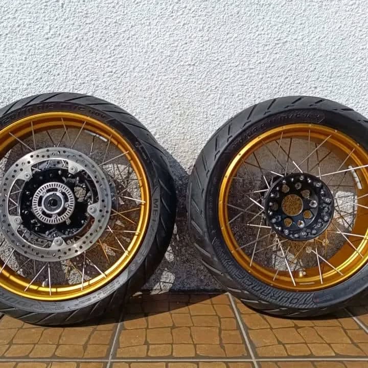 Both wheels are in excellent used condition, straight and true, with no dents or cracks. Tires have plenty of tread left and are ideal for adventure/touring riders looking for a rugged, ready-to-mount setup.
